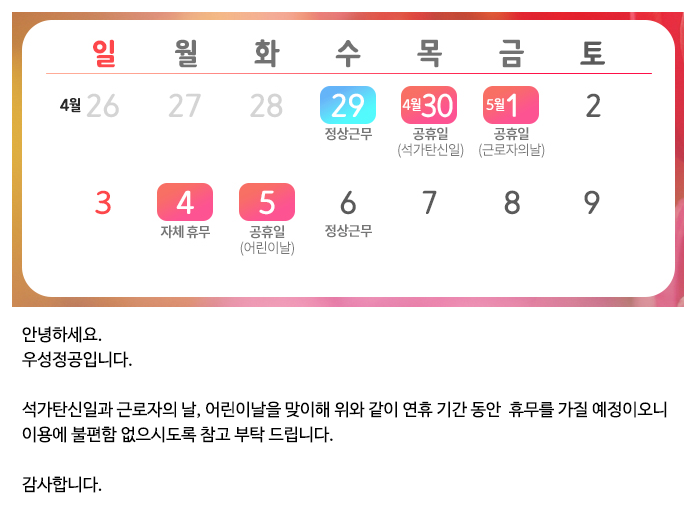 2020³â 4¿ù 30ÀÏ ~ 5¿ù 5ÀÏ ¿¬ÈÞ °øÁö ¾È³»ÀÔ´Ï´Ù.